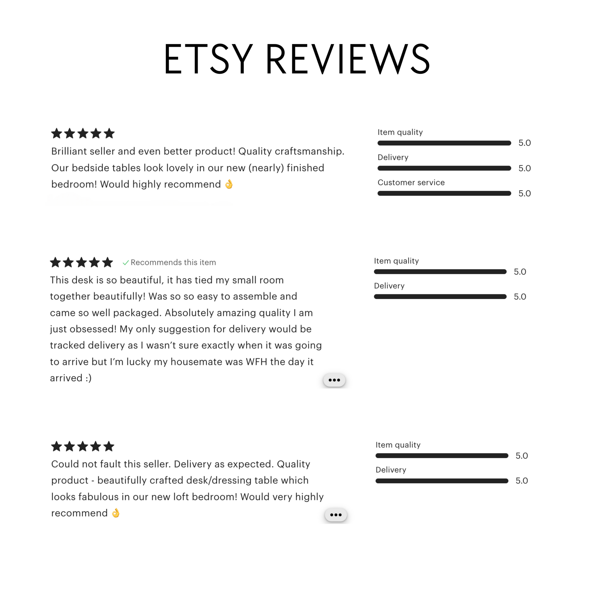 All of our products offer free delivery to the UK, packaged securely to protect our furniture in transit. As all of our items are handmade and we are a small business, we give ourselves 8 days to hand make your item. Delivery is sent with 3-4 day courier. Therefore your order should not take any longer than 12 days.